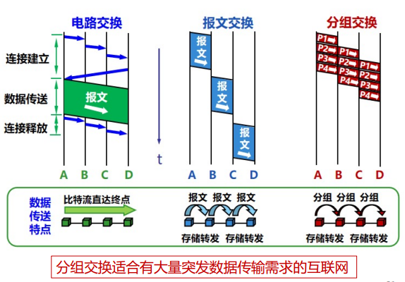 (1)电路交换: 需要建立连接并预留资源,难以实现灵活复用。 (2)报文交换和分组交换: 较灵活,抗毁性高,在传送突发数据时可提高网络利用率。 (3)由于分组长度小于报文长度,分组交换比报文交换的时延小,也有更好的灵活性。 (4)分组交换适合有大量突发数据传输需求的互联网。 (5)分组交换允许更多的用户使用网络。