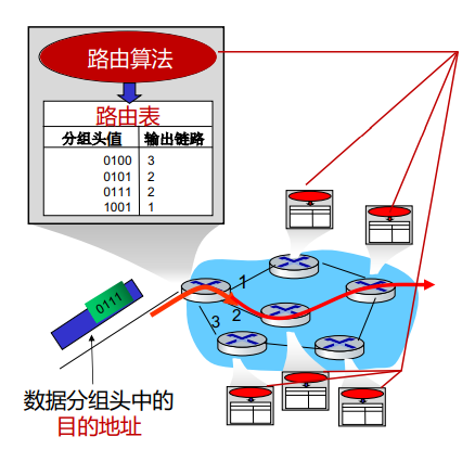 (2)转发 ①本地操作:路由器或交换机将接受到的数据分组转发出去(即移动到该设备的某个输出接口)。 ②确定转发出去的接口/链路:根据从“入接口”收到分组头中的目的地址,查找本地路由表,确定“出接口”。