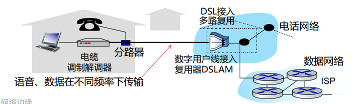 a.DSL电话线上,语音和数据可以同时传输; b.数据进入互联网,语音连接到电话网。