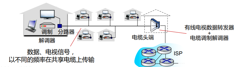 a.家庭利用传统有线电视信号线(同轴电缆)接入头端上网; b.多个家庭共享有线电视的头端; c.不对称:高达40Mbps-1.2Gbps下行传输速率,30-100Mbps上行传输速率。