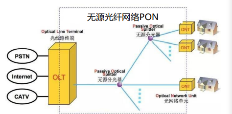a.PON:Passive Optical Network; b.OLT:局端的光线路终端,提供光信号和电信号之间的转换; c.ONU光网络单元(如光猫ONT); d.光猫ONT通过一个或多个无源分光器,连接到局端的光线路终端OLT。  e.整体流程: * 每个家庭具有一个光纤网络端接器(ONT),它由专门的光纤连接到邻近的分配器; * 该分配器把一些家庭(通常少于100个)集结到一根共享的光纤; * 该光纤再连接到本地电话和公司的中心局中的光纤线路端接器(OLT); * 该OLT提供了光信号和电信号之间的转换,经过本地电话公司路由器与因特网相连; * 在家庭中,用户将一台家庭路由器与ONT相连,并经过这台家庭路由器接入因特网。