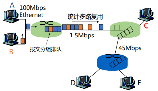 统计多路复用:主机A和B的报文分组按需共享带宽。