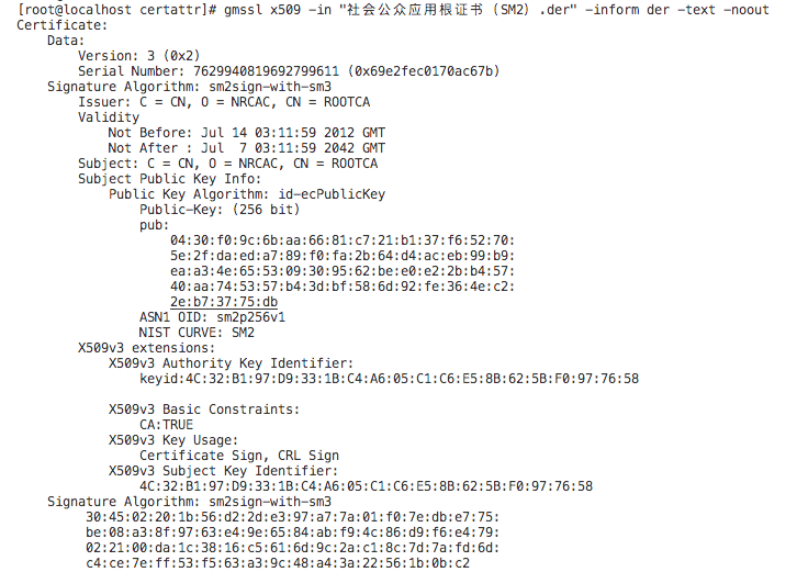 命令 | 说明 | gmssl x509 -in "社会公众应用根证书(SM2).der" -inform der -text -noout | 解析查看证书 |