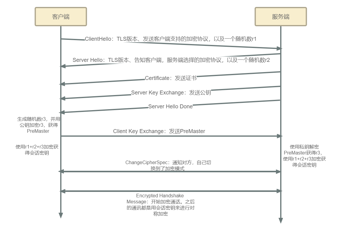 - Encrypted Handshake Message:开始加密通话。之后的通讯都是用会话密钥来进行对称加密