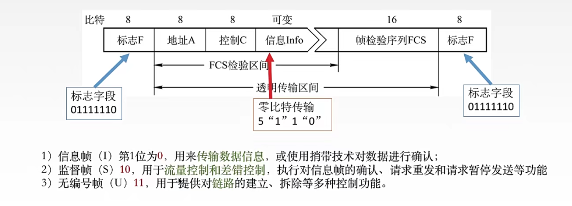 特点: (1)对于任何一种比特流都可透明传输 (2)较高的数据链路传输效率 (3)所有的帧都有帧校验序列(FCS),传输可靠性高 (4)用统一的帧格式来实现传输