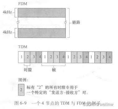 ????????时分多路复用(TDM)和频分多路复用(FDM)时两种能够用于在所有共享信道节点之间划分广播信道宽带的技术。假设一个支持N 个节点的信道且信道的传输速率为R bps。TDM将时间划分为时间帧(time frame),并进一步划分每个时间帧为N个 时隙(slot) 。然后把每个 时隙分配给N个节点中的一个。无论何时某个节点在有分组要发送的时候,它在循环的TDM帧中指派给它的时隙内传 输分组比特。通常,选择的时隙长度应 使一个时隙内能够传输单个分组。