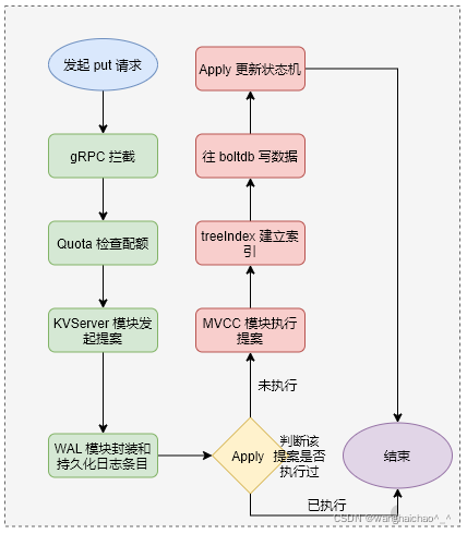 总的来说,这个过程为客户端发起写请求,由 Leader 节点处理,经过拦截器、Quota 配额检查之后,KVServer 提交一个写请求的提案给 Raft 一致性模块,经过 RaftHTTP 网络转发,集群中的其他节点半数以上持久化成功日志条目,提案的状态将会变成已提交。接着 Apply 通过 MVCC 的 treeIndex、boltdb 执行提案内容,成功之后更新状态机。