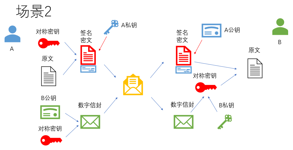 这“两个新钥匙”一般是公认的机构(CA)给二位(A和B)签发的,这样可以确保B收到的是真实的A发送过来的文件,不是伪造的。?