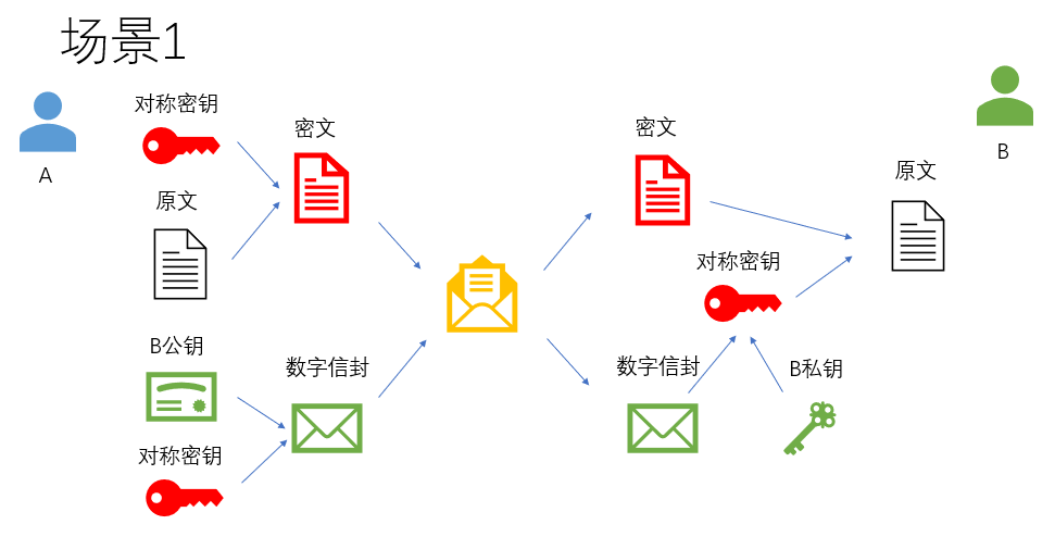 A: 先使用“对称密钥”加密“原文”(得到“密文”), 然后使用“公钥”加密“对称密钥”(得到“数字信封”)