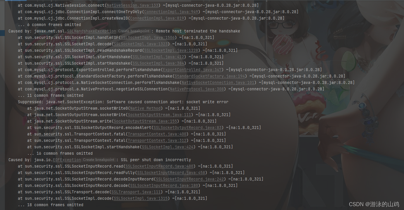 The last packet sent successfully to the server was 0 milliseconds ago. The driver has not received any packets from the server. ?? ?at sun.reflect.NativeConstructorAccessorImpl.newInstance0(Native Method) ~[na:1.8.0_321] ?? ?at sun.reflect.NativeConstructorAccessorImpl.newInstance(NativeConstructorAccessorImpl.java:62) ~[na:1.8.0_321] ?? ?at sun.reflect.DelegatingConstructorAccessorImpl.newInstance(DelegatingConstructorAccessorImpl.java:45) ~[na:1.8.0_321] ?? ?at java.lang.reflect.Constructor.newInstance(Constructor.java:423) ~[na:1.8.0_321] ?? ?at com.mysql.cj.exceptions.ExceptionFactory.createException(ExceptionFactory.java:61) ~[mysql-connector-java-8.0.28.jar:8.0.28] ?? ?at com.mysql.cj.exceptions.ExceptionFactory.createException(ExceptionFactory.java:105) ~[mysql-connector-java-8.0.28.jar:8.0.28] ?? ?at com.mysql.cj.exceptions.ExceptionFactory.createException(ExceptionFactory.java:151) ~[mysql-connector-java-8.0.28.jar:8.0.28] ?? ?at com.mysql.cj.exceptions.ExceptionFactory.createCommunicationsException(ExceptionFactory.java:167) ~[mysql-connector-java-8.0.28.jar:8.0.28] ?? ?at com.mysql.cj.protocol.a.NativeProtocol.negotiateSSLConnection(NativeProtocol.java:317) ~[mysql-connector-java-8.0.28.jar:8.0.28] ?? ?at com.mysql.cj.protocol.a.NativeAuthenticationProvider.connect(NativeAuthenticationProvider.java:204) ~[mysql-connector-java-8.0.28.jar:8.0.28] ?? ?at com.mysql.cj.protocol.a.NativeProtocol.connect(NativeProtocol.java:1369) ~[mysql-connector-java-8.0.28.jar:8.0.28] ?? ?at com.mysql.cj.NativeSession.connect(NativeSession.java:133) ~[mysql-connector-java-8.0.28.jar:8.0.28] ?? ?at com.mysql.cj.jdbc.ConnectionImpl.connectOneTryOnly(ConnectionImpl.java:949) ~[mysql-connector-java-8.0.28.jar:8.0.28] ?? ?at com.mysql.cj.jdbc.ConnectionImpl.createNewIO(ConnectionImpl.java:819) ~[mysql-connector-java-8.0.28.jar:8.0.28] ?? ?... 6 common frames omitted Caused by: javax.net.ssl.SSLHandshakeException: Remote host terminated the handshake ?? ?at sun.security.ssl.SSLSocketImpl.handleEOF(SSLSocketImpl.java:1506) ~[na:1.8.0_321] ?? ?at sun.security.ssl.SSLSocketImpl.decode(SSLSocketImpl.java:1323) ~[na:1.8.0_321] ?? ?at sun.security.ssl.SSLSocketImpl.readHandshakeRecord(SSLSocketImpl.java:1228) ~[na:1.8.0_321] ?? ?at sun.security.ssl.SSLSocketImpl.startHandshake(SSLSocketImpl.java:412) ~[na:1.8.0_321] ?? ?at sun.security.ssl.SSLSocketImpl.startHandshake(SSLSocketImpl.java:384) ~[na:1.8.0_321] ?? ?at com.mysql.cj.protocol.ExportControlled.performTlsHandshake(ExportControlled.java:347) ~[mysql-connector-java-8.0.28.jar:8.0.28] ?? ?at com.mysql.cj.protocol.StandardSocketFactory.performTlsHandshake(StandardSocketFactory.java:194) ~[mysql-connector-java-8.0.28.jar:8.0.28] ?? ?at com.mysql.cj.protocol.a.NativeSocketConnection.performTlsHandshake(NativeSocketConnection.java:101) ~[mysql-connector-java-8.0.28.jar:8.0.28] ?? ?at com.mysql.cj.protocol.a.NativeProtocol.negotiateSSLConnection(NativeProtocol.java:308) ~[mysql-connector-java-8.0.28.jar:8.0.28] ?? ?... 11 common frames omitted ?? ?Suppressed: java.net.SocketException: Software caused connection abort: socket write error ?? ??? ?at java.net.SocketOutputStream.socketWrite0(Native Method) ~[na:1.8.0_321] ?? ??? ?at java.net.SocketOutputStream.socketWrite(SocketOutputStream.java:111) ~[na:1.8.0_321] ?? ??? ?at java.net.SocketOutputStream.write(SocketOutputStream.java:155) ~[na:1.8.0_321] ?? ??? ?at sun.security.ssl.SSLSocketOutputRecord.encodeAlert(SSLSocketOutputRecord.java:83) ~[na:1.8.0_321] ?? ??? ?at sun.security.ssl.TransportContext.fatal(TransportContext.java:400) ~[na:1.8.0_321] ?? ??? ?at sun.security.ssl.TransportContext.fatal(TransportContext.java:312) ~[na:1.8.0_321] ?? ??? ?at sun.security.ssl.SSLSocketImpl.startHandshake(SSLSocketImpl.java:424) ~[na:1.8.0_321] ?? ??? ?... 16 common frames omitted Caused by: java.io.EOFException: SSL peer shut down incorrectly ?? ?at sun.security.ssl.SSLSocketInputRecord.read(SSLSocketInputRecord.java:480) ~[na:1.8.0_321] ?? ?at sun.security.ssl.SSLSocketInputRecord.readFully(SSLSocketInputRecord.java:458) ~[na:1.8.0_321] ?? ?at sun.security.ssl.SSLSocketInputRecord.decodeInputRecord(SSLSocketInputRecord.java:242) ~[na:1.8.0_321] ?? ?at sun.security.ssl.SSLSocketInputRecord.decode(SSLSocketInputRecord.java:180) ~[na:1.8.0_321] ?? ?at sun.security.ssl.SSLTransport.decode(SSLTransport.java:111) ~[na:1.8.0_321] ?? ?at sun.security.ssl.SSLSocketImpl.decode(SSLSocketImpl.java:1315) ~[na:1.8.0_321] ?? ?... 18 common frames omitted ?