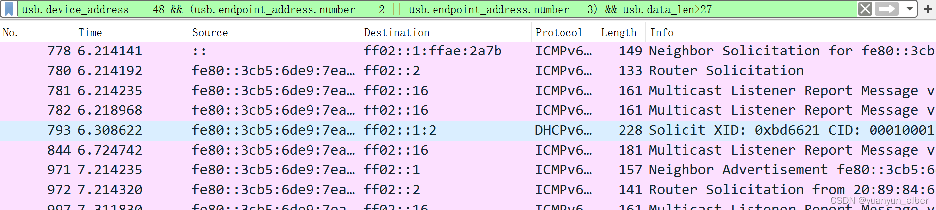 接下来把我们的板子连接到电脑,电脑会试图往外发网络包: