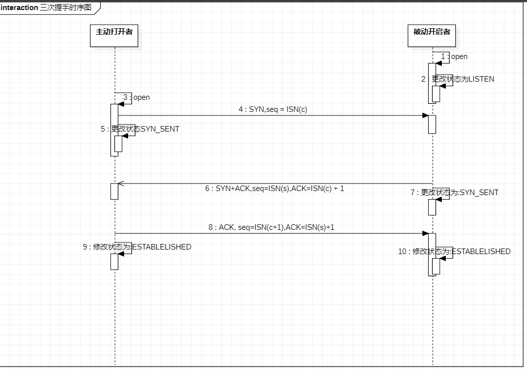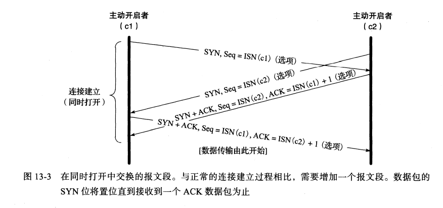 同时打开,双方都为客户端。客户端发送SYN后状态变为SYN_SENT,在该状态下接收到SYN+ACK后状态变为ESTABLISHED状态(SYN包,状态变为SYN_RECV ==> ACK包,状态变为ESTABLISHED)。