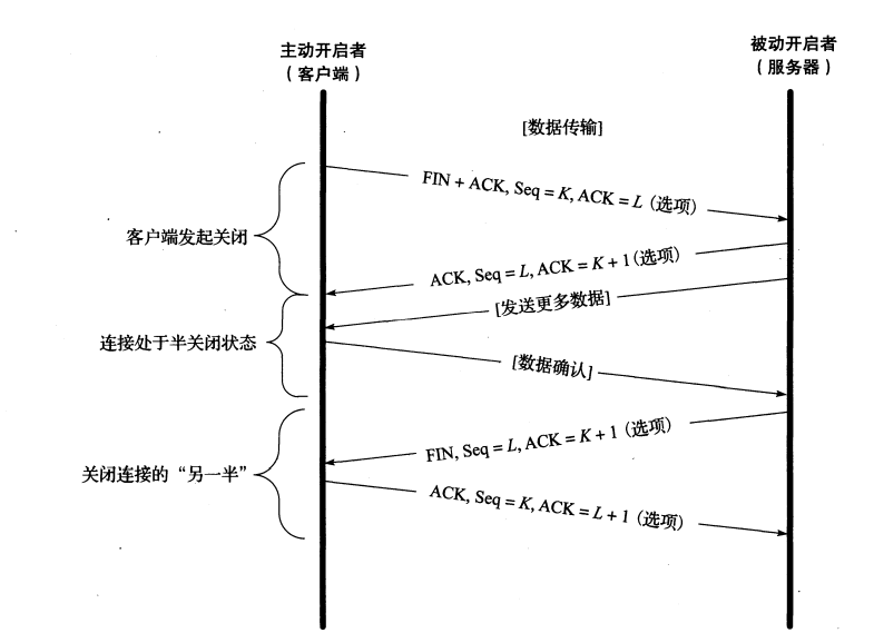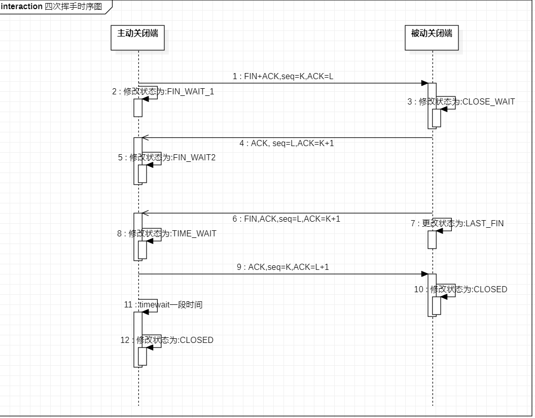 客户端发送SYN+ACK,序列号为K,ACK确认号为L,(FIN结束包需要发送ACK是为了确认关闭前的最后一个包),修改状态为FIN_WAIT_1 服务端收到SYN+ACK,回复ACK确认FIN已经收到,修改状态为CLOSE_WAIT 服务端主动发送SYN+ACK,修改状态为LAST_FIN等待客户端的FIN确认包,。注意这里序列号和确认号和上一步中一样,原因是服务端和客户端没有交换序列号,序列号和确认号维持不变。 客户端收到FIN+ACK的后 修改状态为FIN_WAIT_2 客户端发送FIN的ACK应答,修改状态为TIME_WAIT,一段时间后关闭。注意这里的序列号为k不是服务端确认号ACK期望的k+1,表示这为最后一个应答包。 服务端收到最后一个ACK应答后,关闭