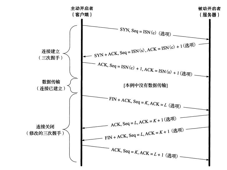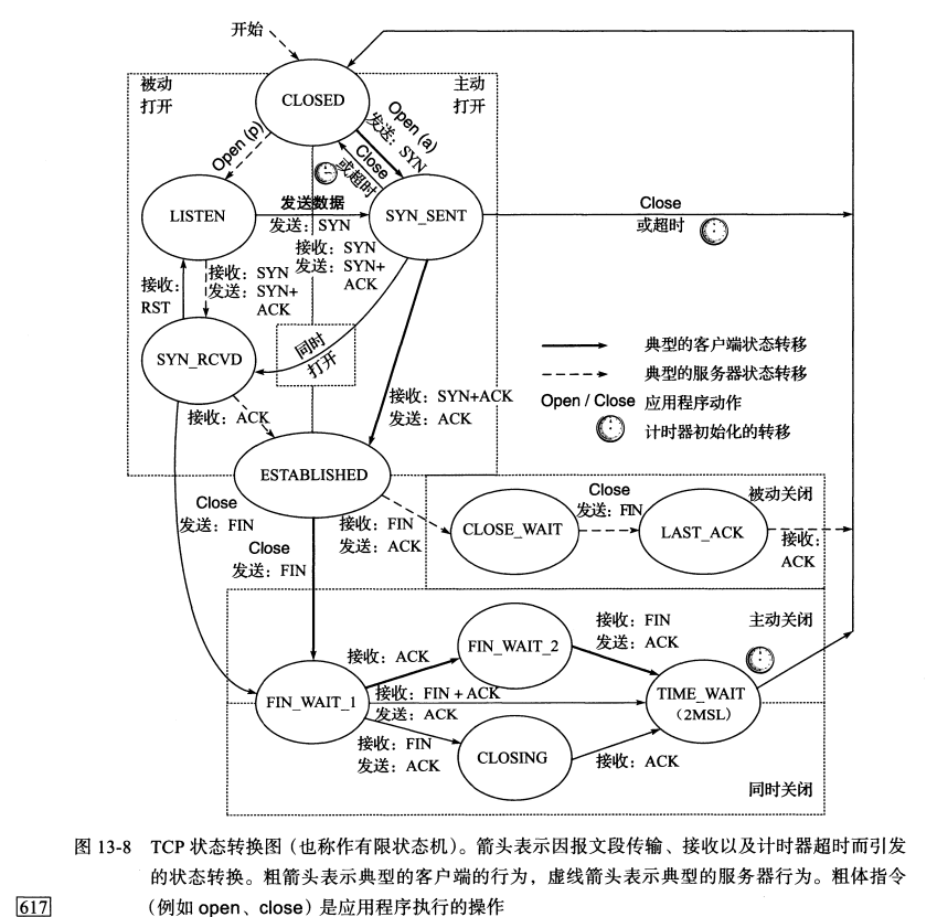 下面为tcp状态转移的详细过程TCP/IP卷一 第二版原图  上面那张图可能不方便查看,下面将客户端可服务端的状态转移图分开了。 里面有部分可能与上图有些不同