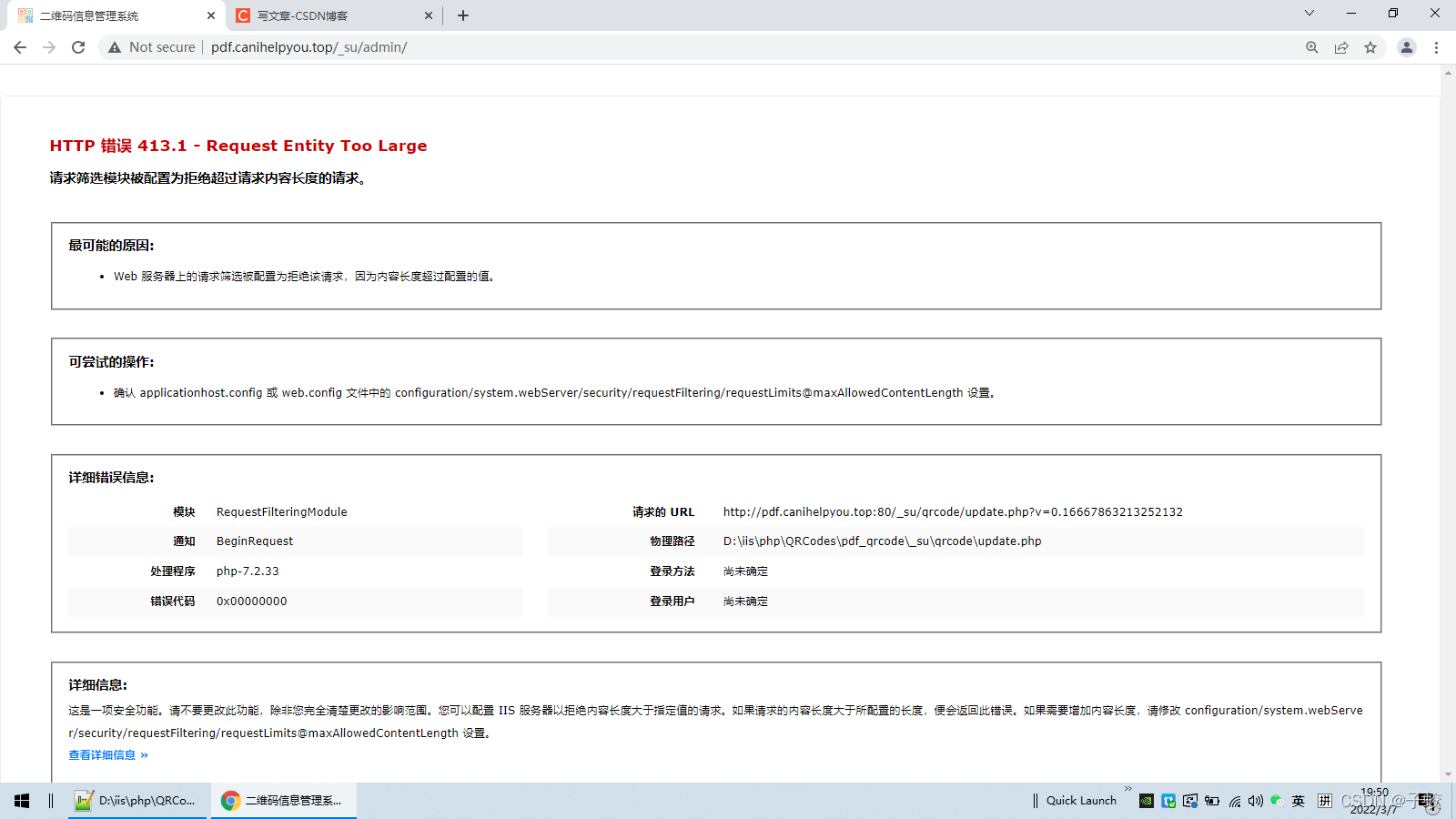 <system.webServer> ?? ?<security> ?? ??? ?<requestFiltering> ?? ??? ??? ?<!-- ?? ??? ??? ?HTTP 错误 413.1 - Request Entity Too Large ?? ??? ??? ?请求筛选模块被配置为拒绝超过请求内容长度的请求。 ?? ??? ??? ?单位:字节(512M)? ?? ??? ??? ?536870912(Bytes) = 512M