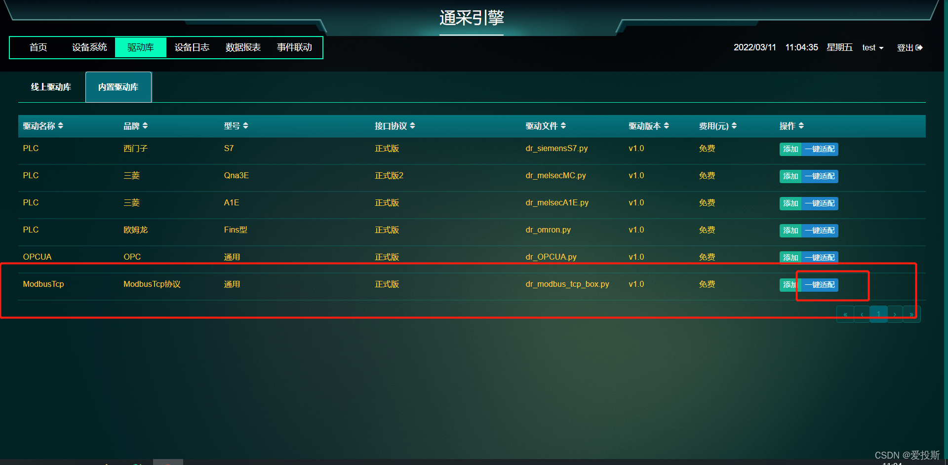 - 点击内置驱动,即可看到Modbus Tcp的驱动,再点击右侧一件适配按钮,即可开始进行参数的填写