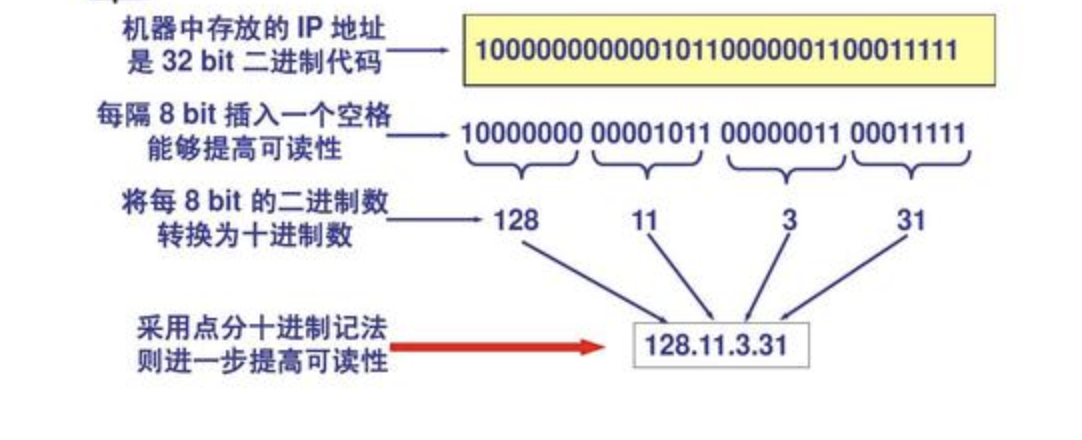 - 将32位的IP地址以每8位为一组,分成4组,每组以"."分割,再将每组的转换成十进制如图所示: