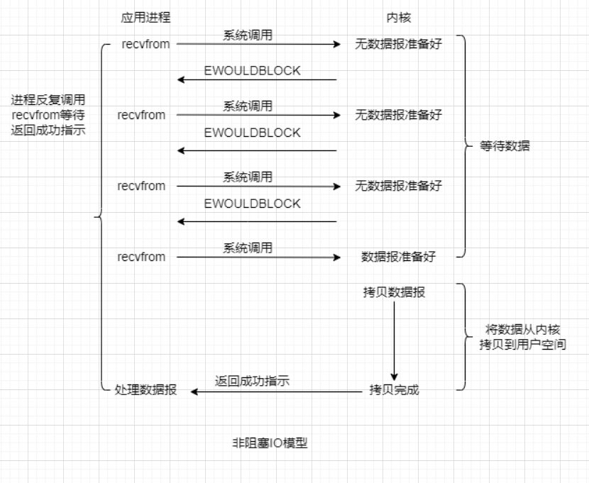 非阻塞IO中进程通过反复调用IO函数,判断数据是否准备好,采用轮询,占用CPU。