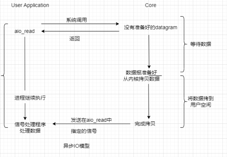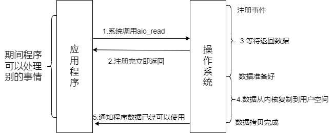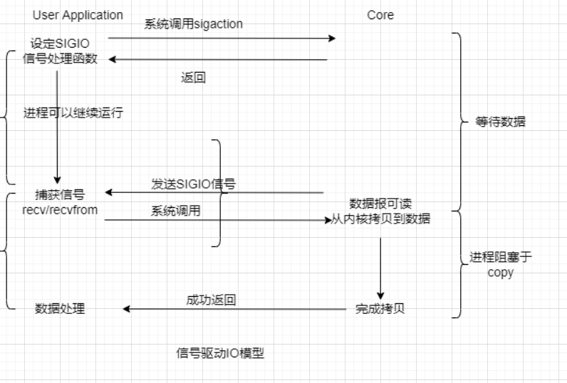 首先需要开启套接字信号驱动功能,通过系统调用sinaction执行信号处理函数,信号处理函数直接返回,进程继续工作,当数据准备就绪,生成一个siglo信号,通知应用程序取数据。