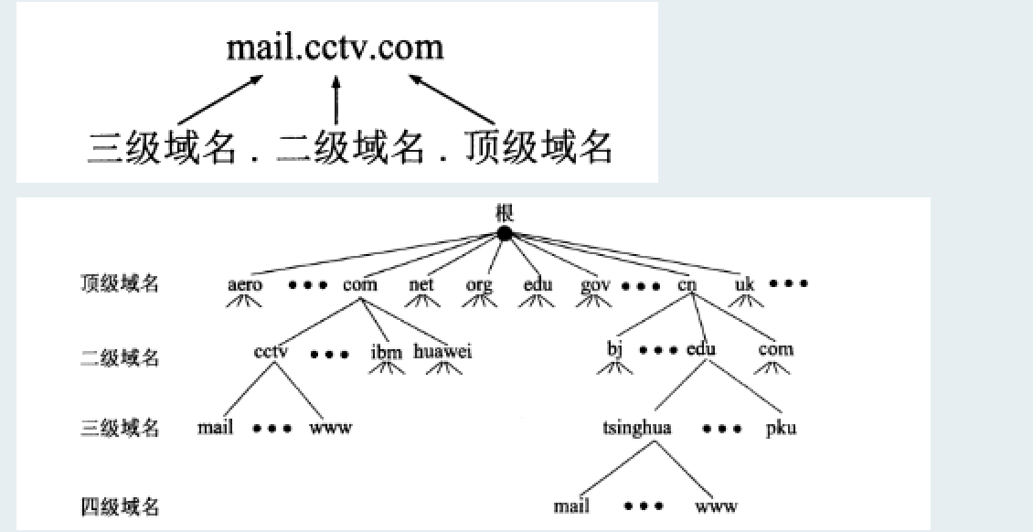 - 一个域名有多个层次组成,从上层到下层分为顶级域名。二级域名,三级域名以及四季域名,所有域名可以化成一颗域名树;
