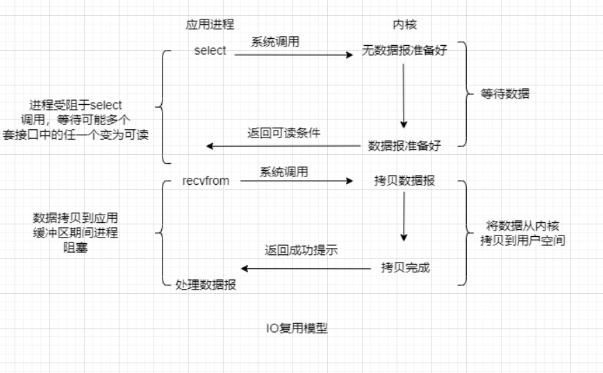 主要使用复用器:select、poll、epoll 一个进程可以监听多个事件,能实现对多个端口进行监听,多个连接共享一个等待机制。
