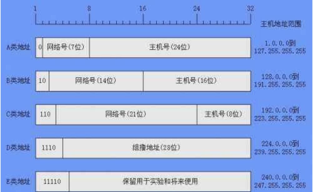 - IP地址分成四级,分别为A类,B类,C类,D类,根据IP地址中第一位到第四位的比特列对网络标识和主机标识进行区分;