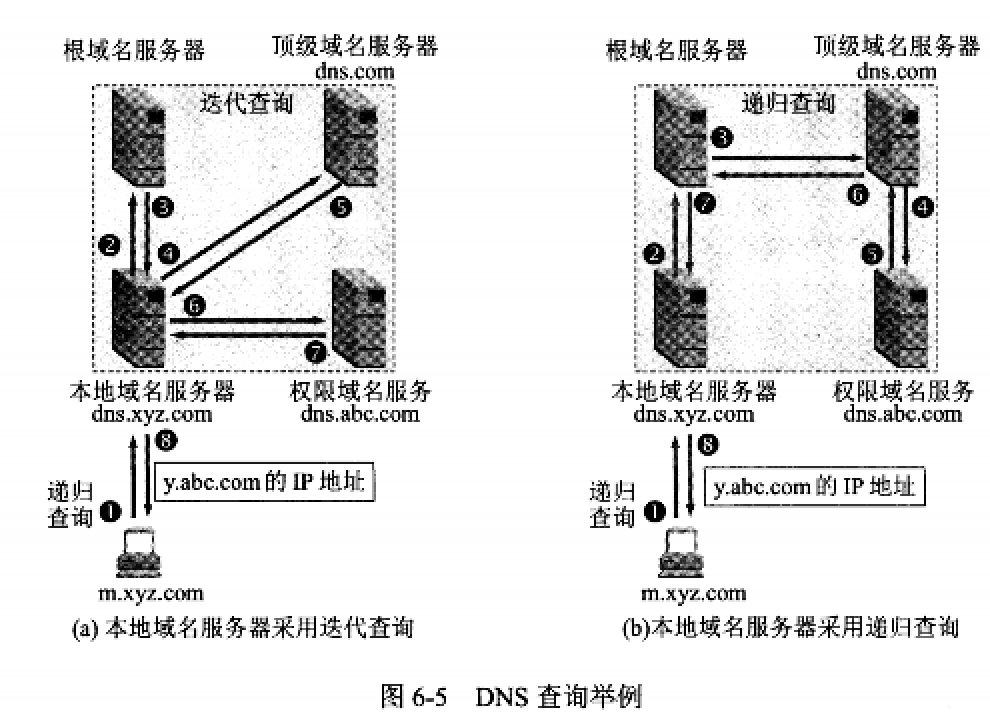 - 迭代方式:本地域名服务器向一个域名服务器解析请求之后,结果返回到本地域名服务器,然后本地域名服务器继续向其他域名服务器请求解析;