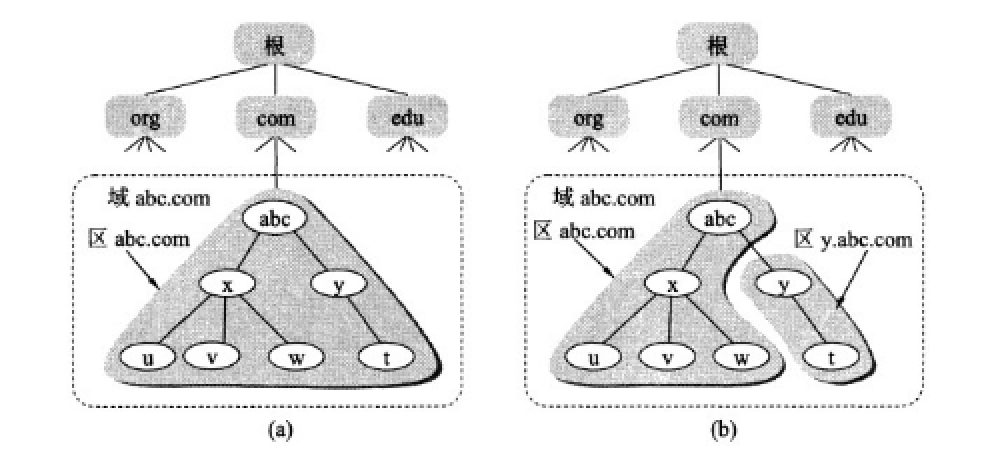 - 注意:区和域概念不同,可以在一个域中划分多个区,图b在域abc.com中划分了两个区abc.com和y.abc.com;