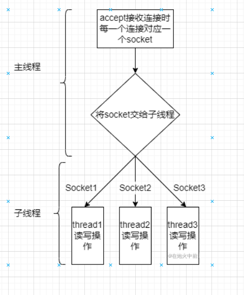 - 在accept能够接收多用户连接,通过循环来接,借助于主线程主要接收客户端的连接(accept),子线程需要进行IO读写;