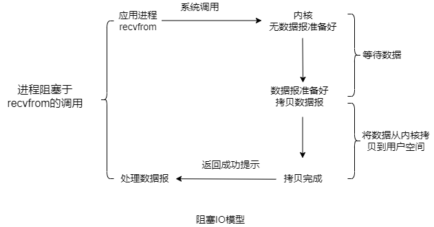阻塞IO中从用户发起调用开始,数据等待、数据拷贝都是需要用户进程,直到数据拷贝完成返回,用户进程才可以继续执行,否则一直阻塞。