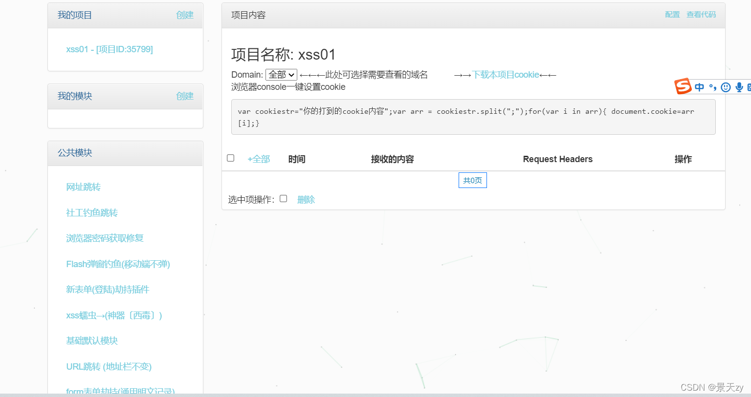 ????????网上类似的平台很多,都是基于XSS Platform搭建的。登录XSS Platform(可自行搜索获取,也可以进行自己搭建),主界面如下: