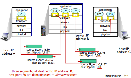 解复用:接收主机使用这四个值,将报文段引导至适当的 socket