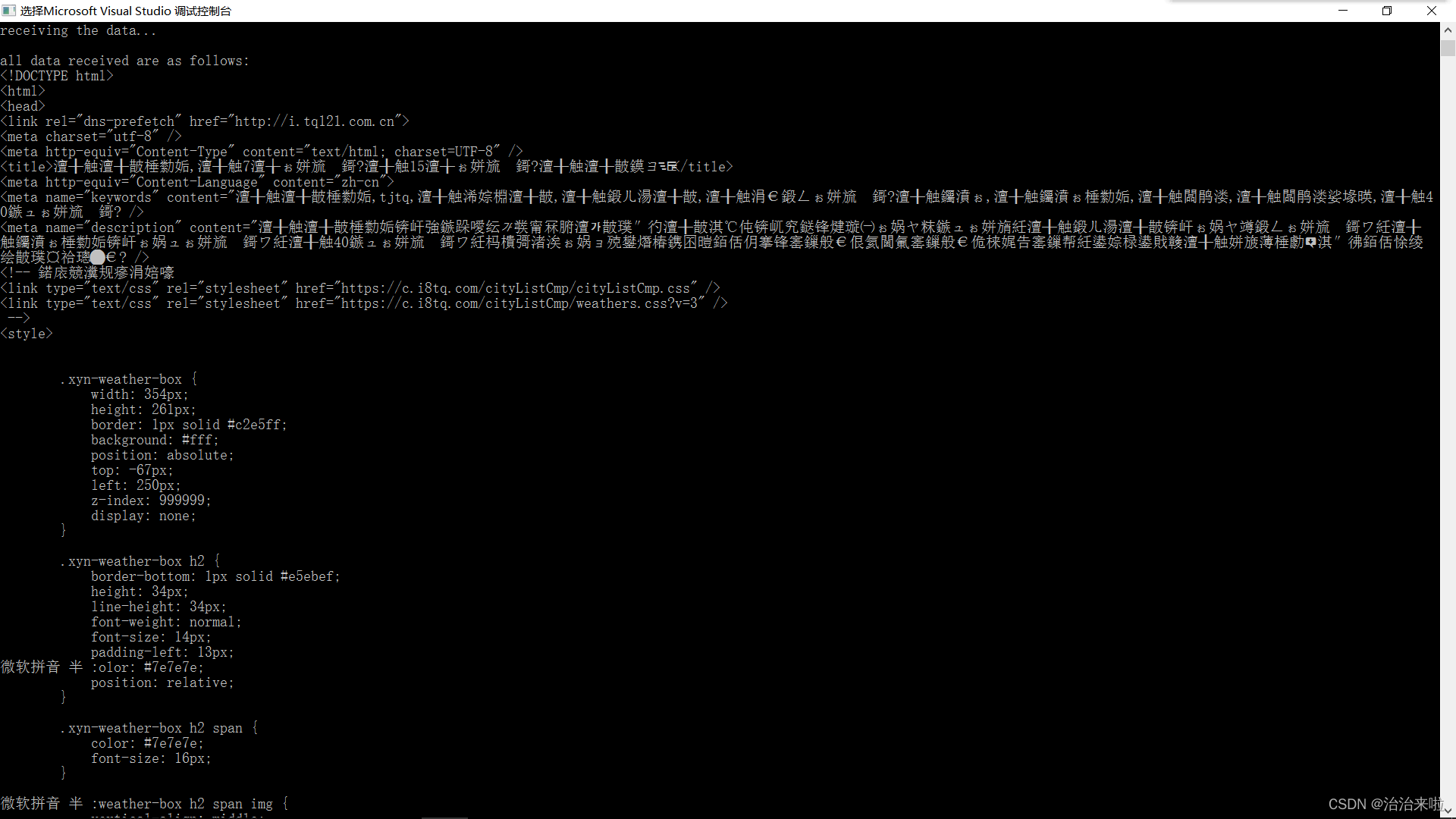 ok,现在我们换一个网站再来测试一下你就可以更加清晰的看出来效果了,这个网站由于数据量比较少,所以客户端一次便接收完成了。修改代码中的如下位置内容(访问链接为:http://www.weather.com.cn/weather/101030100.shtml):