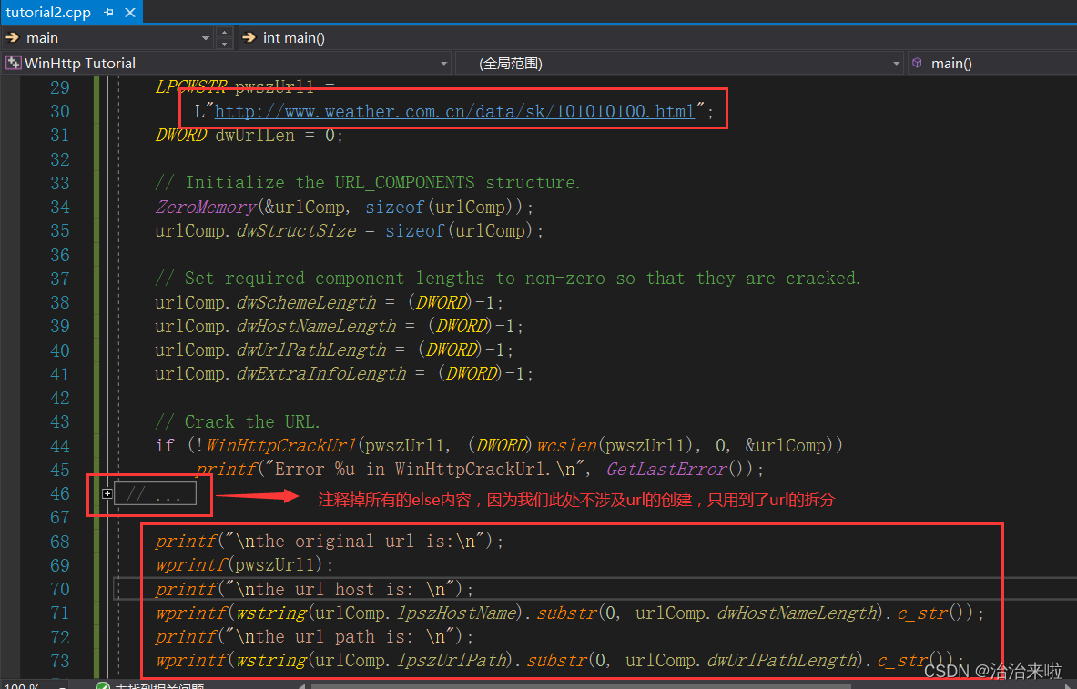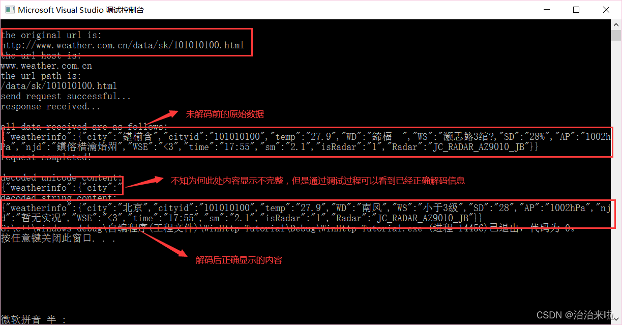 ok,我们把访问链接改为最原始的那个:http://www.weather.com.cn/data/sk/101010100.html,然后加入如下的代码: