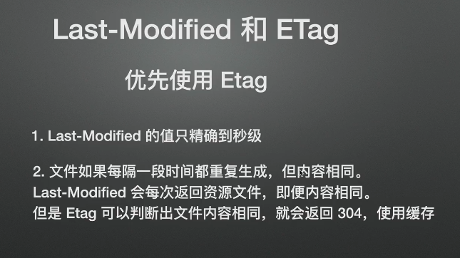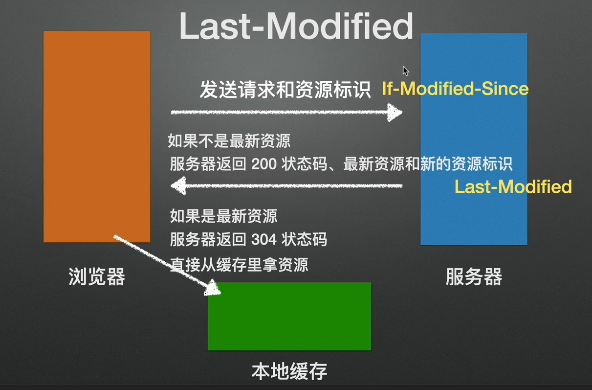 当服务器返回Last-Modified时下一次发送请求时浏览器就会携带资源标识(再请求头中)只不过发送请求时键名时if-Modified-Since,服务器就会判断if-Modified-Since,如果这个资源标识对应的内容有一个修改的话就会返回200状态码,并发送新的资源和新的资源标识,如果这个资源标识对应的内容没有修改的话就会返回304状态码,然后浏览器就会从缓存中取出资源文件