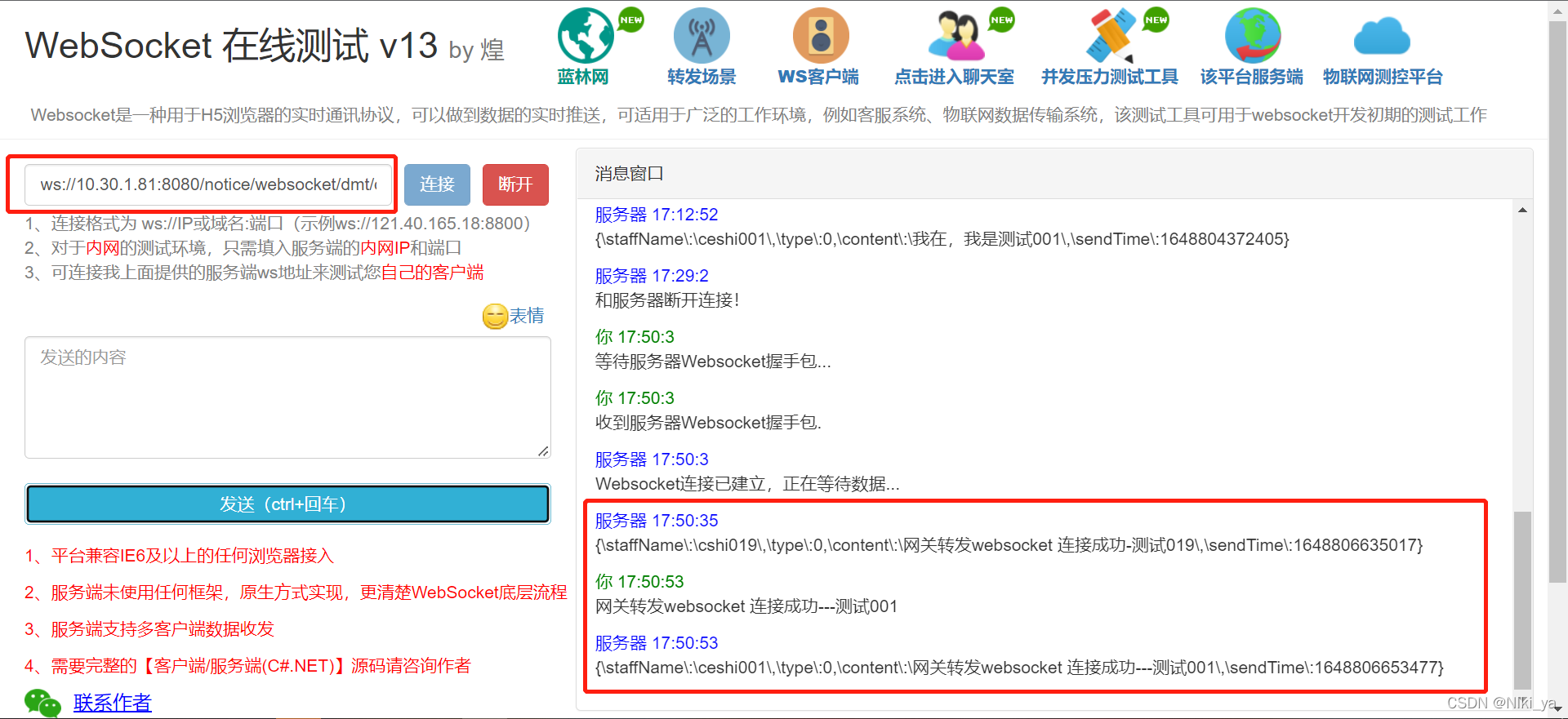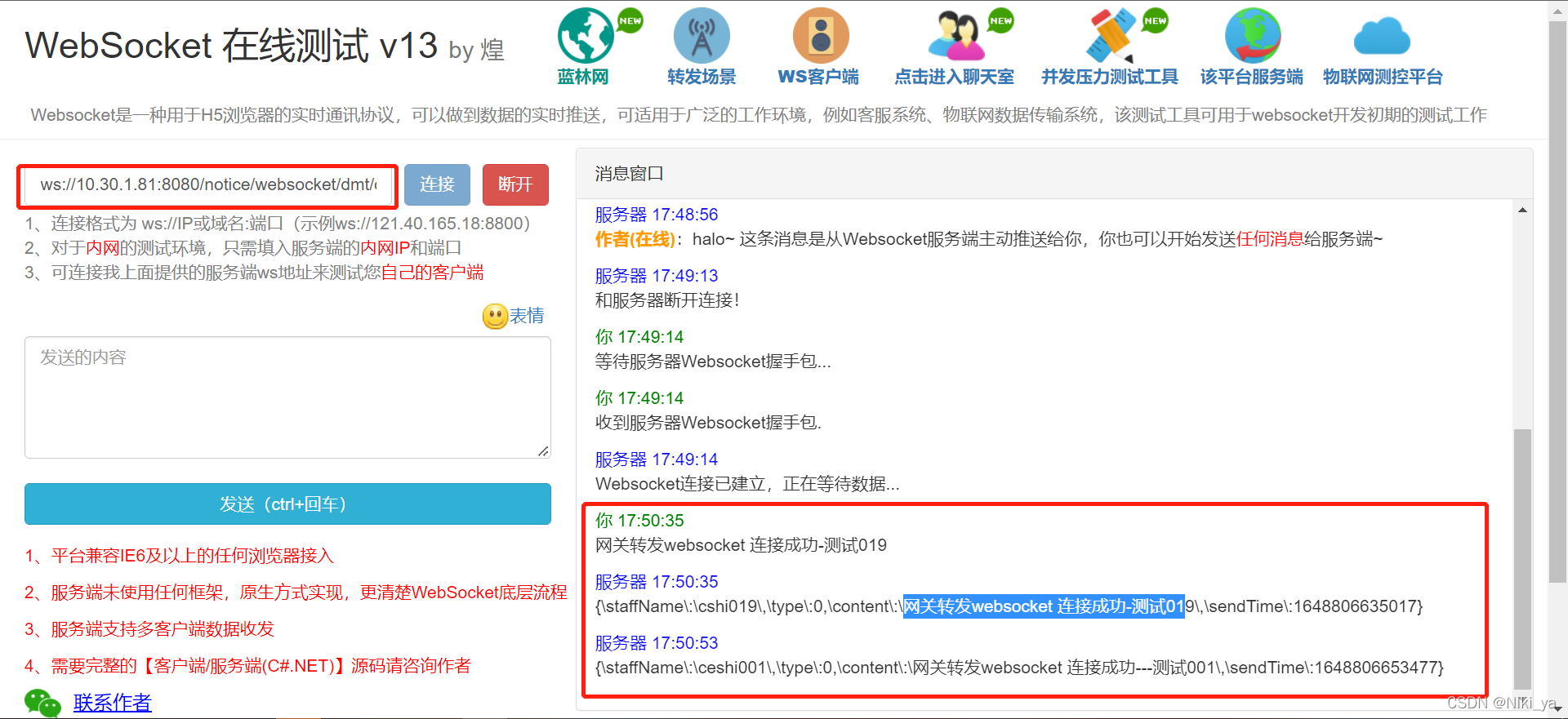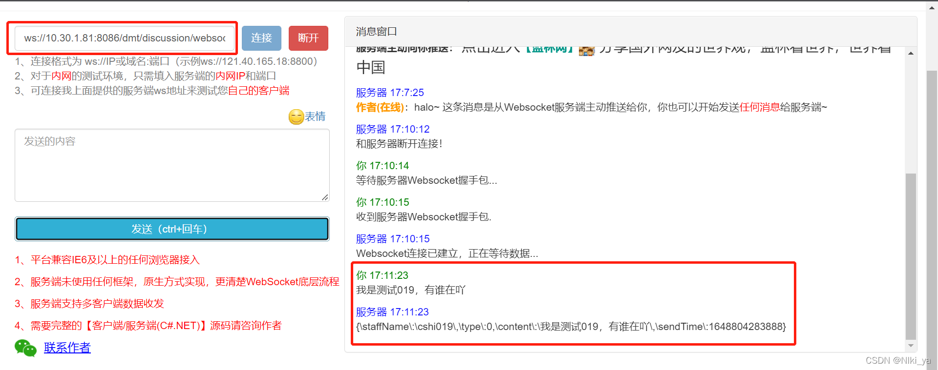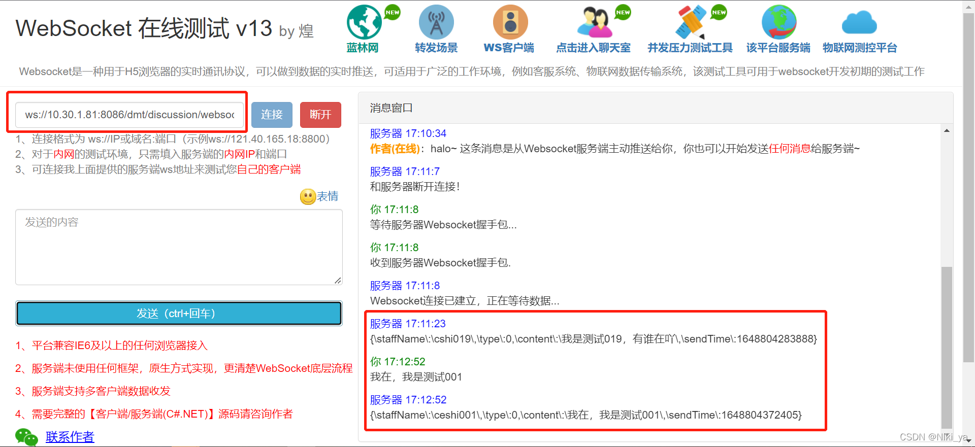 测试地址示例:ws://本地IP地址:端口号/notice/websocket/dmt/discussion/websocket?discussionId=1507261309312798722&staffId=1481884657660043266&staffNo=cshi019&staffName=cshi019&token=token内容&timeStamp=时间戳毫秒