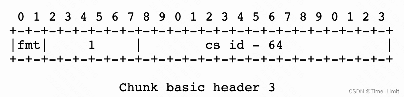 RTMP规定当第 2 - 7 个比特的值为 1 时,chunk stream id 占用 22 个比特,其值减去 64 后存储在第 8 - 23 个比特中。取值范围为 [64, 65599]。