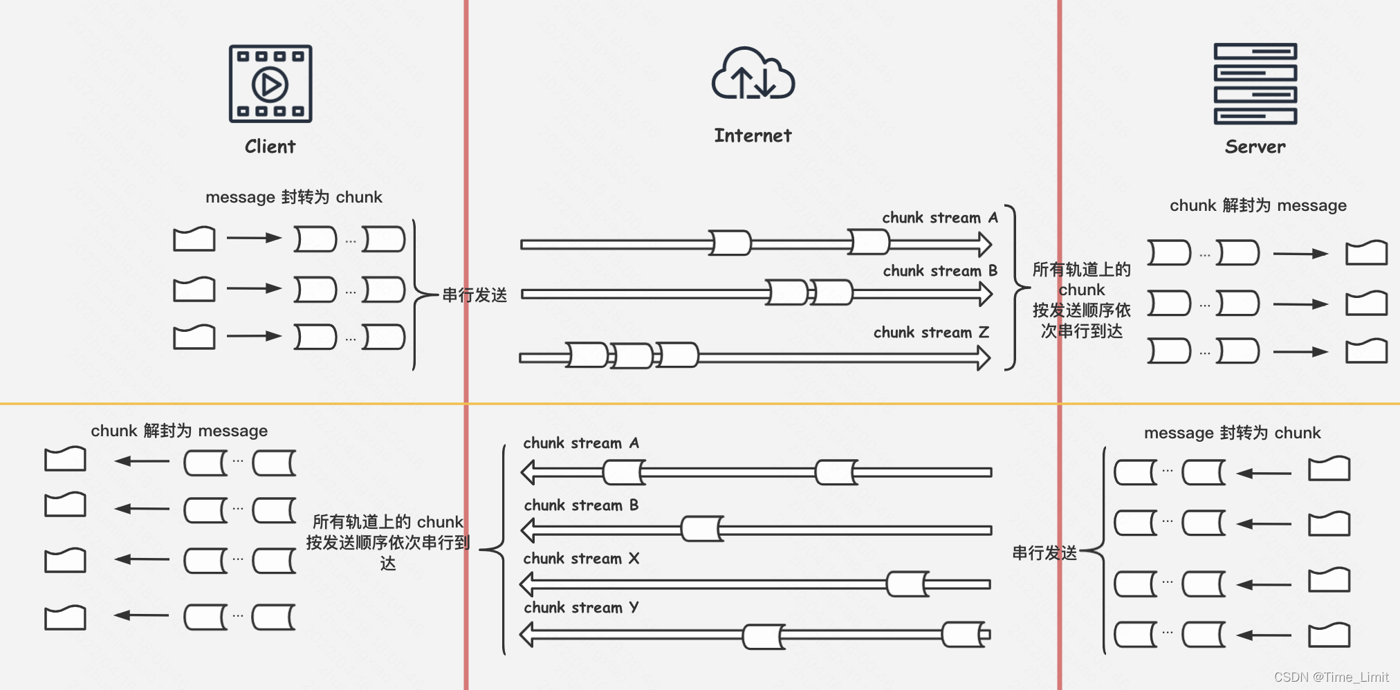 - 同一个 message 产生的多个 chunk 只会在一条 chunk stream 串行发送。