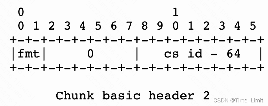 RTMP规定当第 2 - 7 个比特的值为 0 时,chunk stream id 占用 14 个比特,其值减去 64 后存储在第 8 - 15 个比特中。取值范围为 [64, 319]。