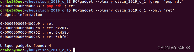 解决办法:通过ROPdadget工具获得正确的pop_rdi和ret的地址