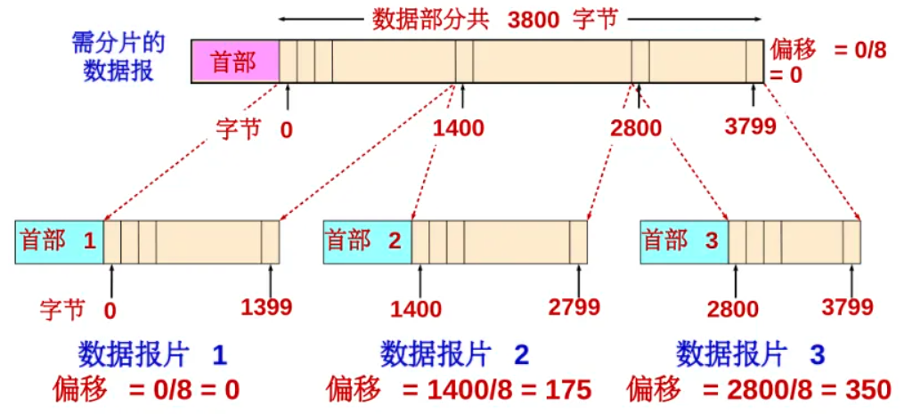(7) 片偏移 占13位。以8个字节为单位,指较长分组在分片后,某片在原分组的相对位置。