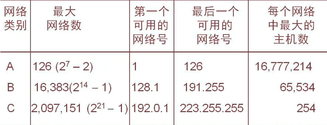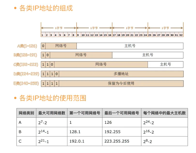 常用的三种类别的ip地址 A类地址的网络号字段站1字节,只有7位可供使用 B类地址网络号字段占2个字节,前面两位以固定(1 0)剩下14位可以进行分配。 C类地址有3个字节的网路号字段,最前面的三位是(1 1 0),还有21位 可以分配。