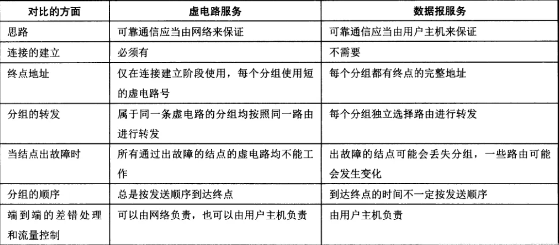 面向连接还是无连接? 虚电路服务,数据报服务 互联网采用是设计思想:网络层向上只提供简单灵活的、无连接的、尽量最大努力交付的数据报服务。网络层不提供服务质量的承诺 下图是虚电路服务与数据报服务的对比: