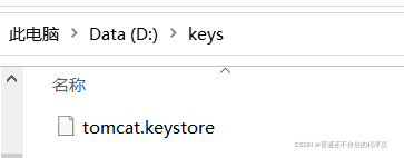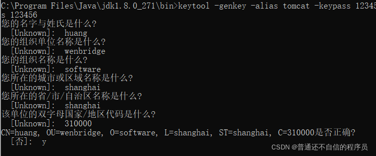 keytool -genkey -alias tomcat(自定义名称) -keypass 123456(自定义密码1)?-keyalg RSA -keysize 1024 -validity 365 -keystore D:/keys/tomcat.keystore -storepass 123456(自定义密码2)