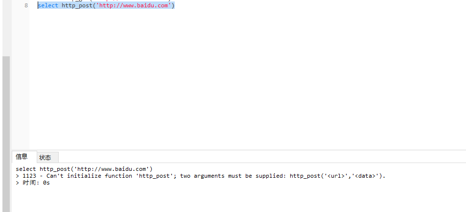 ?? ?if (args->arg_count != 2) ?? ?{ ?? ??? ?strncpy(message, ?? ??? ??? ?"two arguments must be supplied: http_post('<url>','<data>').", ?? ??? ??? ?MYSQL_ERRMSG_SIZE); ?? ??? ?return 1; ?? ?}