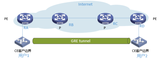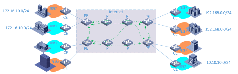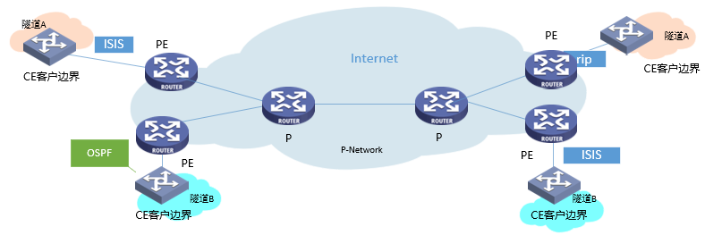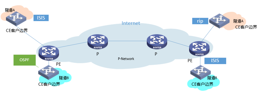 而且,如果隧道建立在CE上,则必须由用户维护,如果建立在PE上,则又无法解决地址冲突问题。