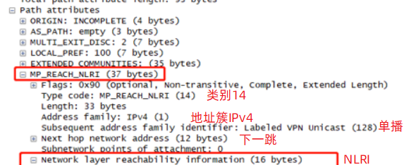 NLRI(Network Layer Reachability Information):表示的是新增路由的目的网段信息,如果在Address-family区域中指明采用的地址簇是VPNv4地址簇,那么该处格式将包含两个部分,第一部分是私网标签,是一个MPLS标签值;第二部分是一个VPNv4地址,其格式是RD+IPv4地址。VPNv4地址格式是BGP/MPLS 虚拟专用网络传递私网路由所需要的。