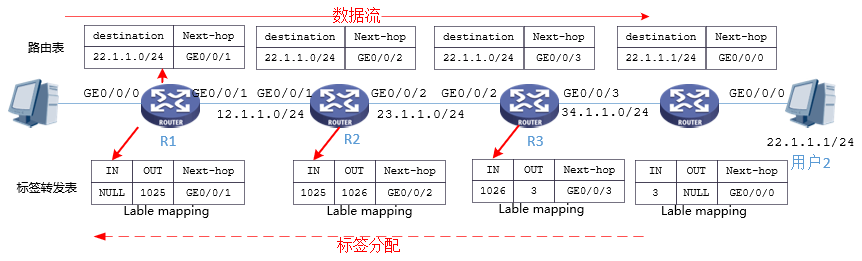 (1)、根据用户2的具体IP地址通过MPLS转发。 R1、R2、R3、R4路由器运行MPLS协议,并建立起了R1到R4之间的标签访问路径。用户1访问用户2,报文的目的地址是22.1.1.1从R1进入,该报文将进行MPLS转发,在LSP上的LSR只检查MPLS标签,在R1设备为入节点,通过标签压入将报文封装在MPLS标签里。
