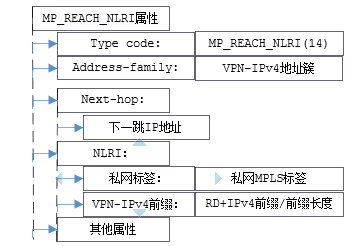 Path Attributes(路由信息的属性)中增加的两项: MP_REACH_NLRI:多协议可达NLRI。用于发布可达路由及下一跳信息。 MP_UNREACH_NLRI:多协议不可达NLRI。用于撤销不可达路由。