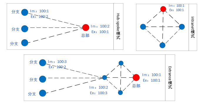 中心访问控制设备所在站点称为Hub站点,其他用户站点称为Spoke站点。用户Hub站点可以与每一Spoke站点进行互通,而每一Spoke站点之间禁止相互访问。简单来说就是分部如果需要互访,都通过总部来进行。 - Extrance模式